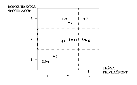 Pri tem odlocitvenem problemu so variante proizvodi oziroma proizvodni programi. Vsak proizvod ocenimo po omenjenih dveh dejavnikih. Ocene vnesemo v matriko trznega portfelja (slika 5). Polozaj proizvoda v matriki opredeljuje osnovo za oblikovanje poslovne strategije, ki je v splosnem lahko narascajoca, mirujoca, selektivna ali opuscajoca.